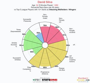 Una delle novità più interessanti prodotte da Pep Guardiola al Manchester City è stata quella di utilizzare David Silva e De Bruyne da mezzali. Giocando da interno lo spagnolo ha avuto la possibilità di muoversi verticalmente lungo il mezzo spazio sinistro, per cucire il gioco in zona di rifinitura. Proprio le sue qualità associative, a cominciare dalla capacità di muovere rapidamente palla e di farsi trovare smarcato oltre la linea di pressione avversaria, hanno consentito a Silva di esaltarsi nella nuova posizione e di aprire o trovare linee di passaggio per consentire ai Citizens di risalire il campo ed essere pericolosi in zona di rifinitura (1.43 p/90 passaggi per il tiro questa stagione). Da qui poi l’ex Valencia può invadere l’area avversaria. I 7.17 p/90 tocchi in area di rigore nella Premier appena conclusa dimostrano proprio questa sua capacità di attaccare in avanti. In più ci le 6 reti e i 10 assist registrati in 27 partite.