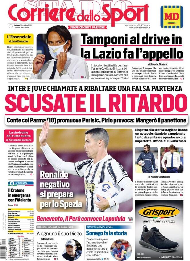 Rassegna stampa, di seguito le immagini delle prime pagine dei quotidiani sportivi in edicola oggi, sabato 31 ottobre 2020