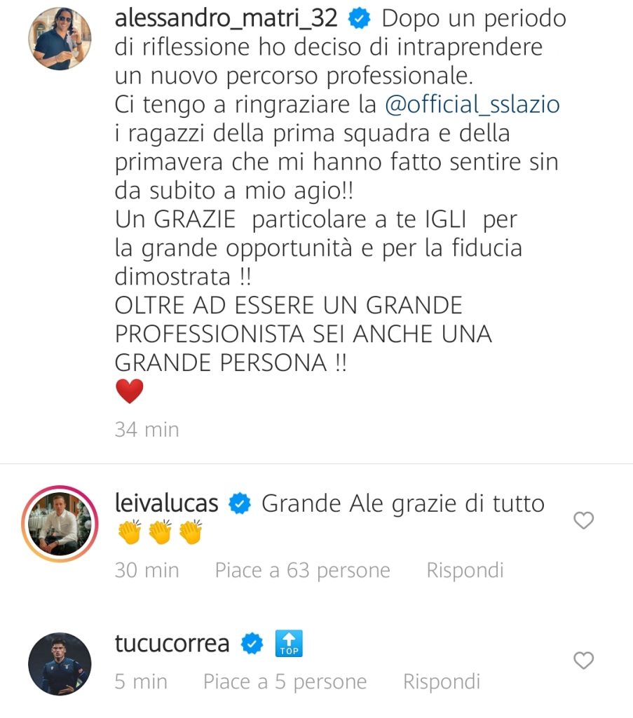 Alessandro Matri saluta la Lazio con un lungo post su Instagram ringraziando la società e il direttore sportivo Igli Tare. Sotto il post sono arrivati anche i saluti, con tanto di ringraziamenti, da parte di Lucas Leiva e Correa.
