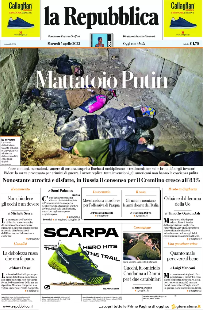 Guerra Ucraina-Russia, le prime pagine dei quotidiani generalisti italiani in edicola il 5 aprile 2022