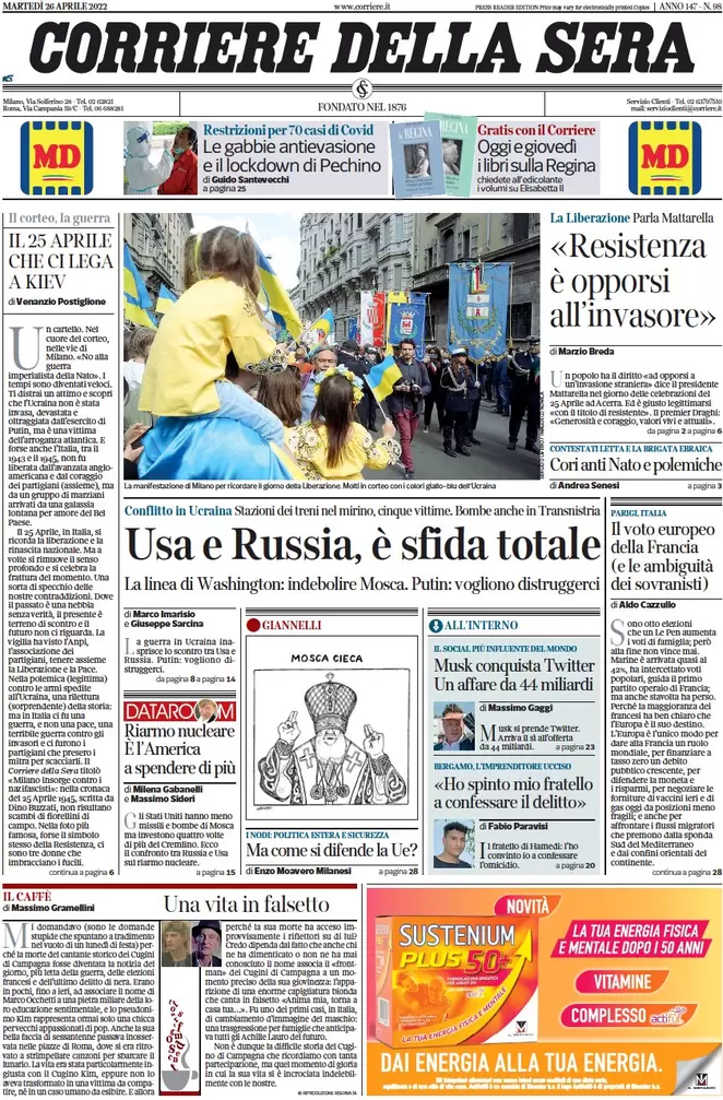 Guerra Ucraina-Russia, le prime pagine dei quotidiani generalisti italiani in edicola il 26 aprile 2022