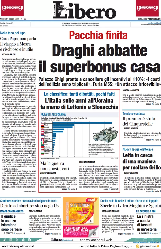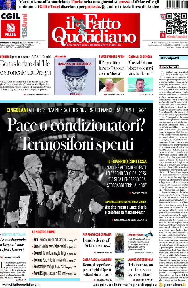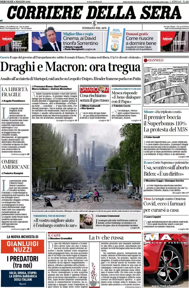 ...Guerra Ucraina-Russia, le prime pagine dei quotidiani generalisti italiani in edicola l’11 maggio 2022