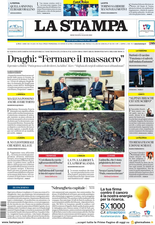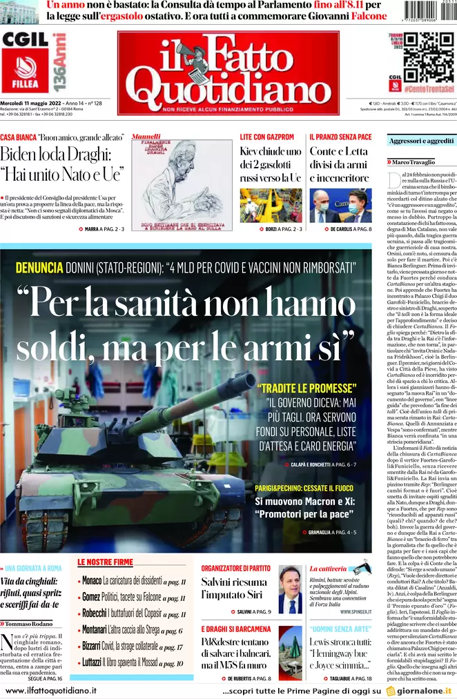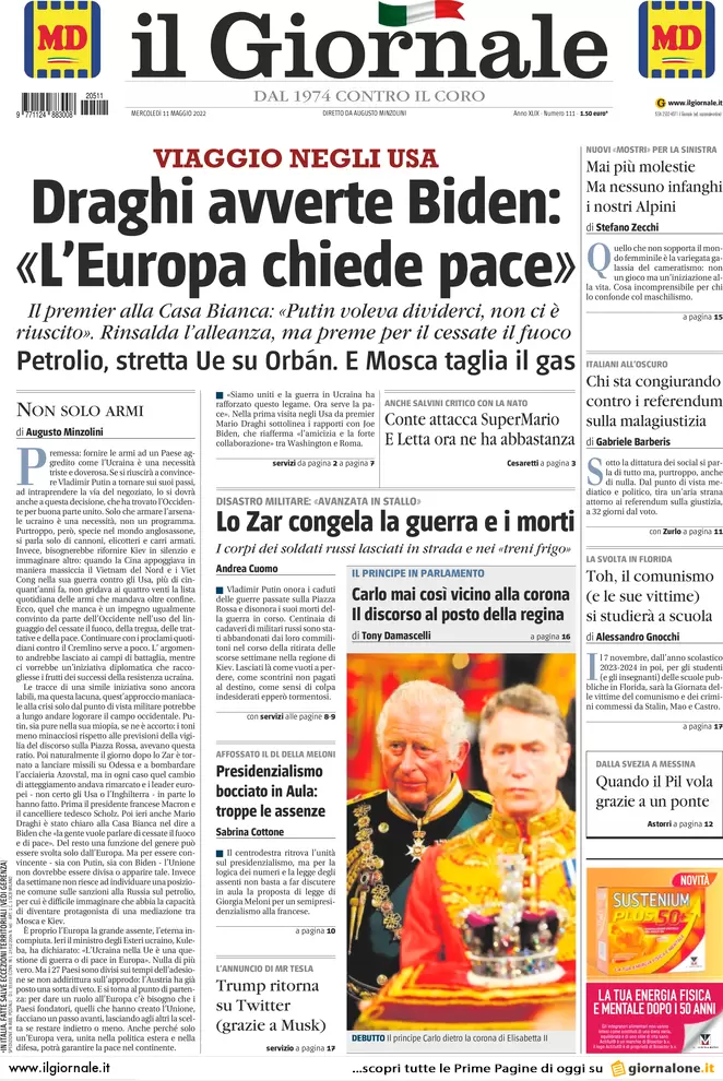 Guerra Ucraina-Russia, le prime pagine dei quotidiani generalisti italiani del 13 maggio 2022