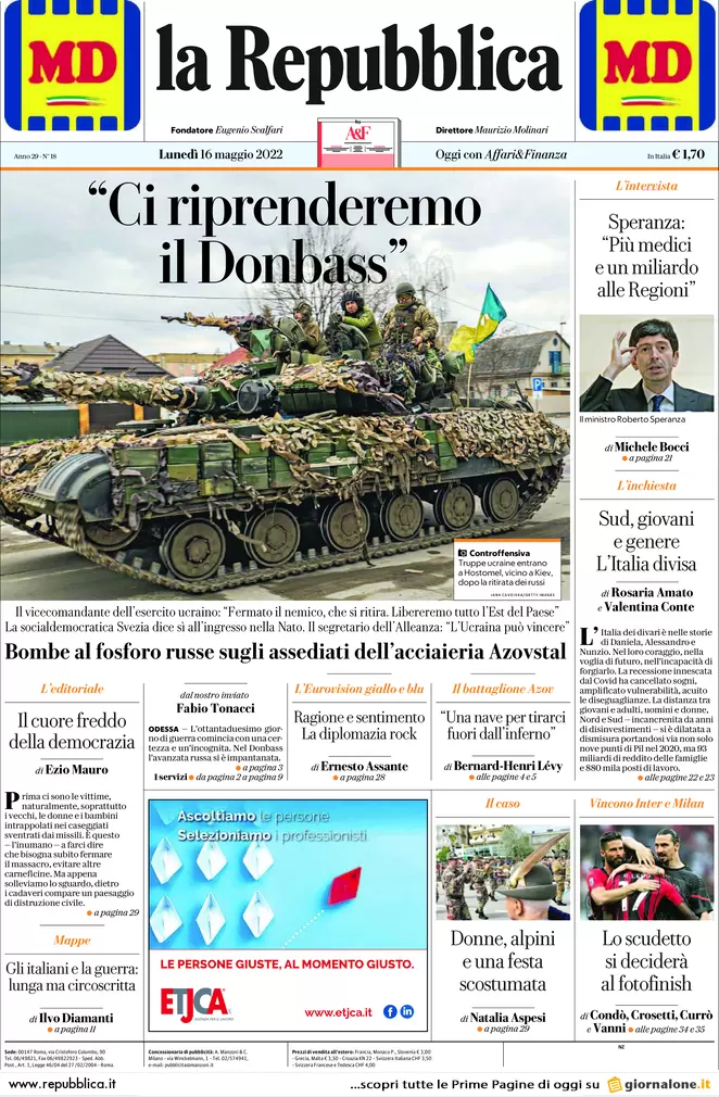 Guerra Ucraina-Russia, le aperture dei quotidiani generalisti italiani del 16 maggio 2022