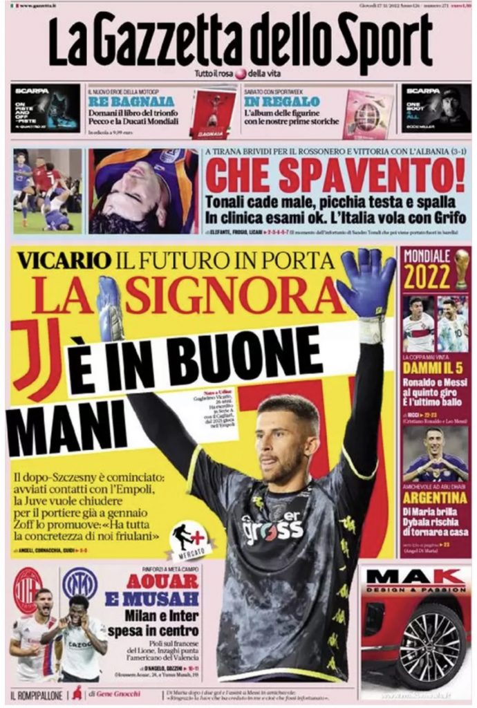 Rassegna stampa, le prime pagine dei quotidiani sportivi italiani in edicola il 17 novembre 2022