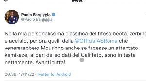 “Nella mia personalissima classifica del tifoso beota, zerbino e acefalo, per ora quelli della Roma che venererebbero Mourinho anche se facesse un attentato kamikaze, al pari dei soldati del Califfato, sono in testa nettamente. Avanti tutta!”, ha scritto il giornalista Paolo Bargiggia sul proprio profilo Twitter. Un post, ovviamente, non proprio accettato con entusiasmo dagli utenti social giallorossi.