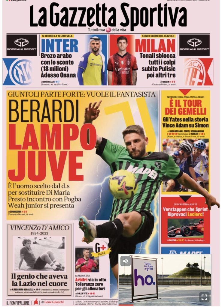 Domenica 2 luglio, le prime pagine dei quotidiani sportivi in edicola.