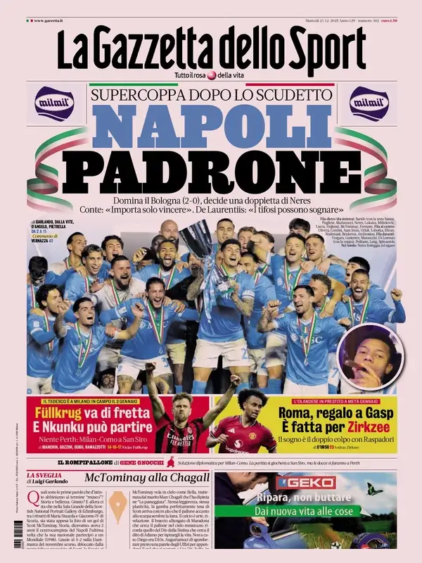 Le prime pagine dei quotidiani sportivi italiani di oggi, martedƬ 23 dicembre 2025...