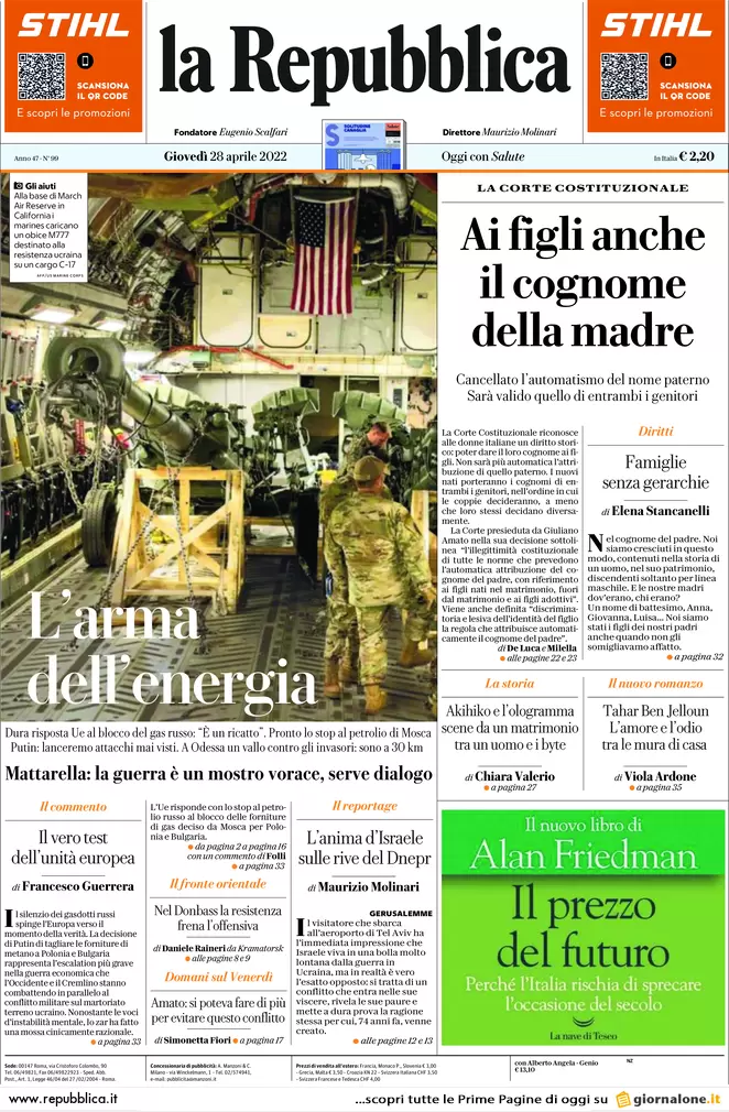 Guerra Ucraina-Russia, le prime pagine dei quotidiani generalisti italiani del 28 aprile 2022