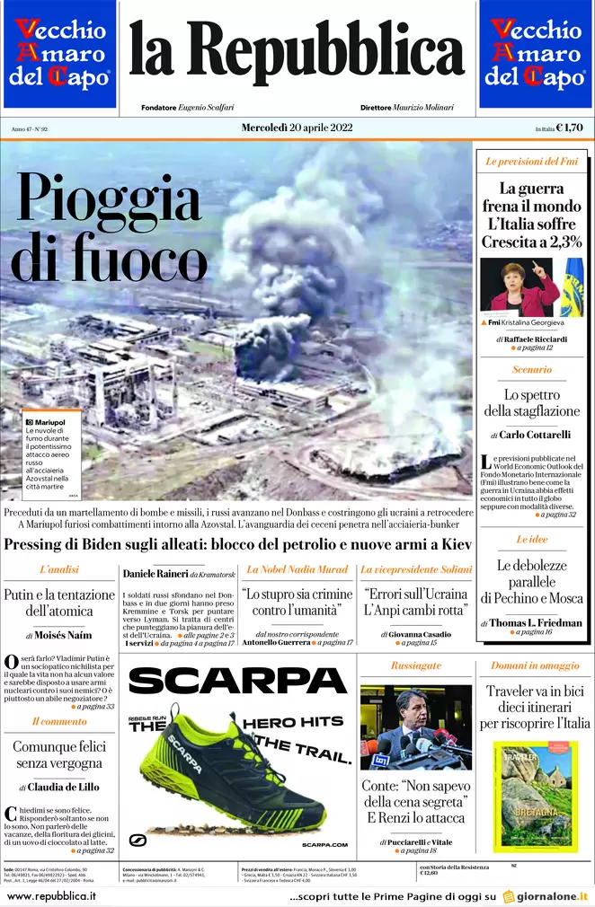 Guerra Ucraina-Russia, le prime pagine dei quotidiani generalisti italiani del 20 aprile 2022
