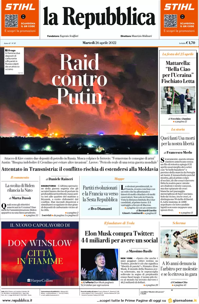 Guerra Ucraina-Russia, le prime pagine dei quotidiani generalisti italiani in edicola il 26 aprile 2022