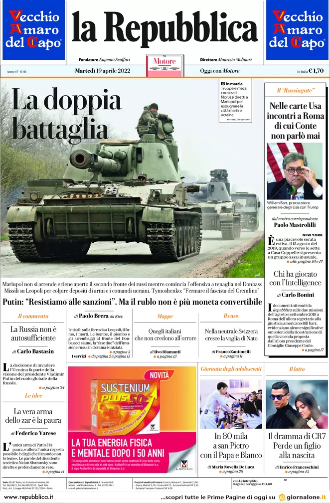 Guerra Ucraina-Russia, le prime pagine dei quotidiani generalisti italiani in edicola il 19 aprile 2022