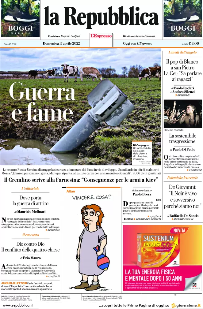 Guerra Ucraina-Russia, le prime pagine dei quotidiani generalisti italiani in edicola il 17 aprile 2022
