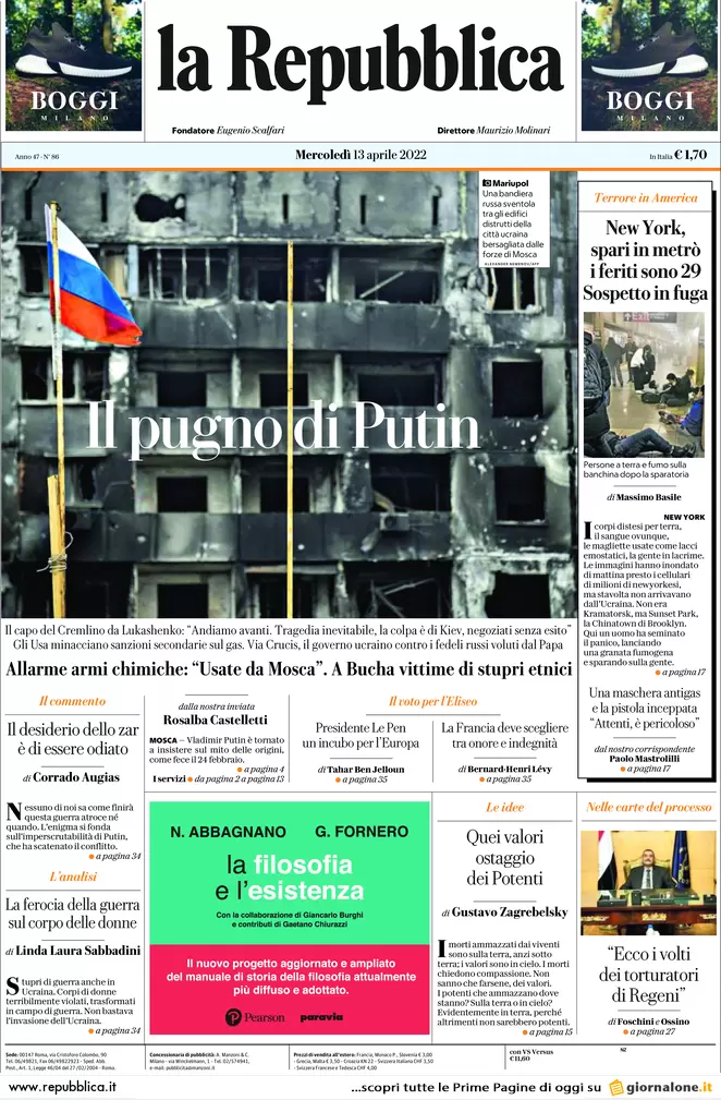 Guerra Ucraina-Russia, le prime pagine dei quotidiani generalisti italiani sul conflitto in edicola il 13 aprile 2022
