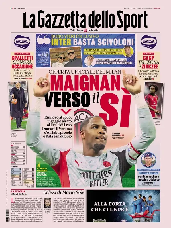 Le prime pagine dei quotidiani sportivi italiani di oggi, sabato 27 dicembre 2025...